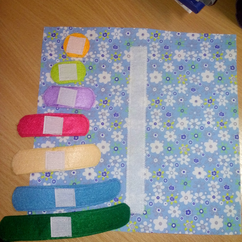 Страничка называется «Пирамидка», её основная развивающая и обучающая составляющие таковы: мелкая моторика (учимся работать с липучкой) и сенсорика (фактуры и цвета), понятия целое - часть, больше - меньше.