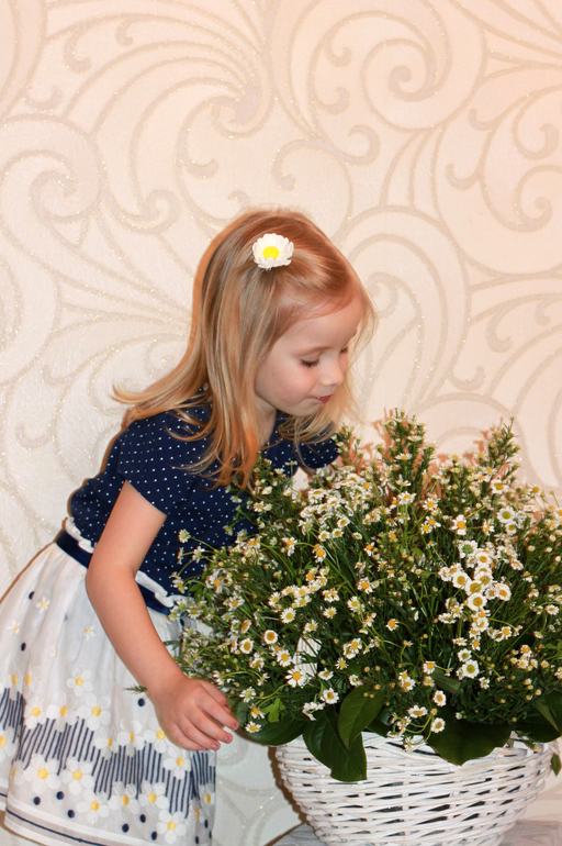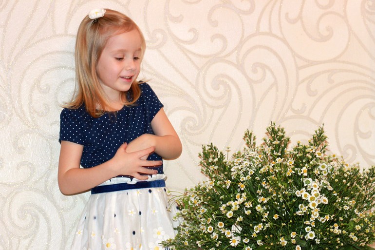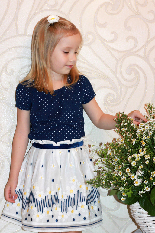 Для кого-то 8 марта - это непременно тюльпаны, а нам вот подарили корзину ромашек, а Полинка даже с удовольствием попозировала. У нас ведь в шкафу ботанический сад, каких только цветочных принтов нет, а ромашки так одни из самых любимых. Здесь на Полинке простенькая юбочка с вышивкой на батисте. Таких на Осинке много встречается, причем они повторяют бренды типа Моннализы, качество отменное, а цена более, чем привлекательная. Покупаешь нужный метраж, у меня здесь 1,5 м., высота см. 45 примерно, собираешь на резинку, ну еще про подъюбник не забываем, просвечивает же, и юбочка готова.