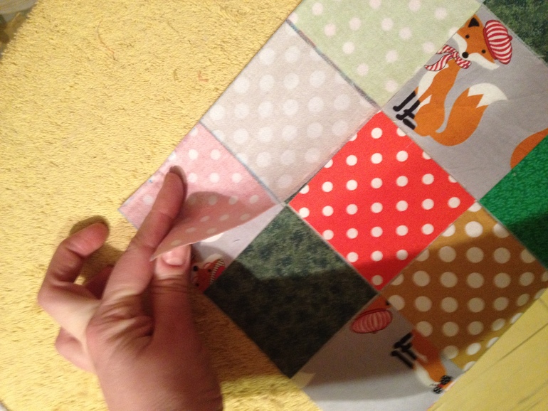 Кладем разрисованный флизелин на стол или гладильную доску клейкой стороной наверх и раскладываем наши квадраты. Потом аккуратно прижимаем утюгом. Утюгом не гладим в разные стороны, иначе все сместится, приклеится, получится чушь. Обрезаем края, утюжим уже смелее с изнанки чтоб окончательно все зафиксировать.