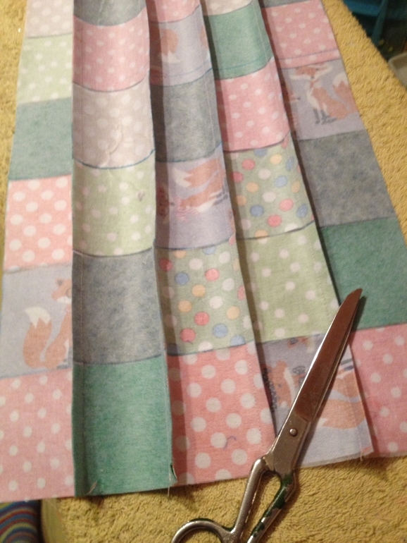 Прострочили всё вдоль, разрезаем все швы и разутюживаем в разные стороны. Сначала с изнанки, очень аккуратно, стараясь не растягивать ткань, потом с лица, там будут небольшие..мм.. дефекты.. не знаю как назвать, разравниваем их.