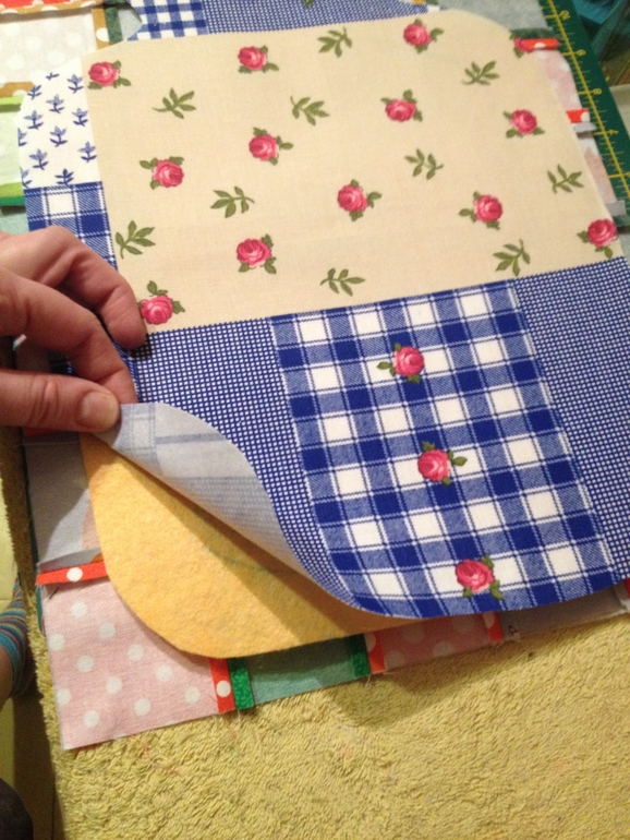 Складываем сэндвич вот так, накалываем булавками и сметываем. Если у вас это салфетка или ланчмат, и топ используется полностью, то изнанка и средний слой должны быть чуть больше чем топ, мало-ли, вдруг чего съедет.