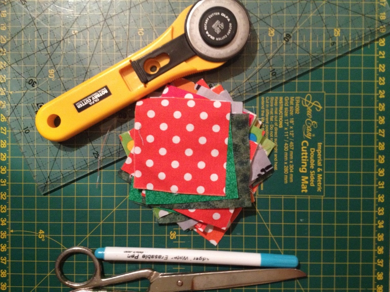 Итак, берем тряпочки и режем. Вот весь мой скарб- нож, мат, линейка. Если этого нет, берем обычную линейку и треугольник, водорастворимый маркер, и рисуем квадратики на наших лоскутках. Потом аккуратно вырезаем их ножницами.
