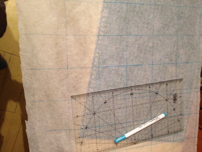 Сгибаем, пытаемся совместить перпендикулярные будущему шву линии, скалываем булавками