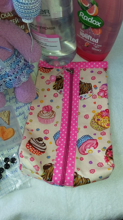 А вот и та самая вкусненькая косметичка))очень здоровская!удобненькая и функциональная,так как у нее ко всему прочему с одной стороны имеется петелечка,благодаря чему ее можно и поставить и при необходимости повесить,что очень удобно в дороге!