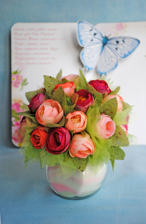 ТопиарииЯ влюблена в эти цветы! Как только закупилась ими, ручки чесались сделать с ними композицию. Как раз и вазочка с солью стояла неоформленная. Вот сегодня всё и сложилось: время, материалы и настроение.