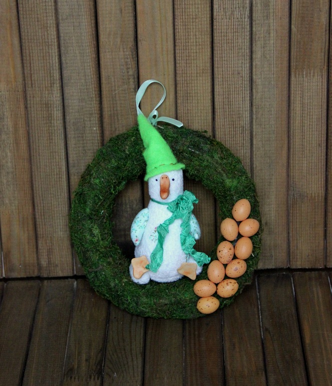 Поделки с детками.В детский сад принимают опять поделки, потом с ними делают большой стенд-стеллаж у входа. Мы снова решили поучаствовать. Я шила гуся, а Никита, Надя и папа приклеивали пенопластовые яйца к венку-основе. Мне кажется, они были не прочь заклеить ими весь венок, но яиц было не так много))