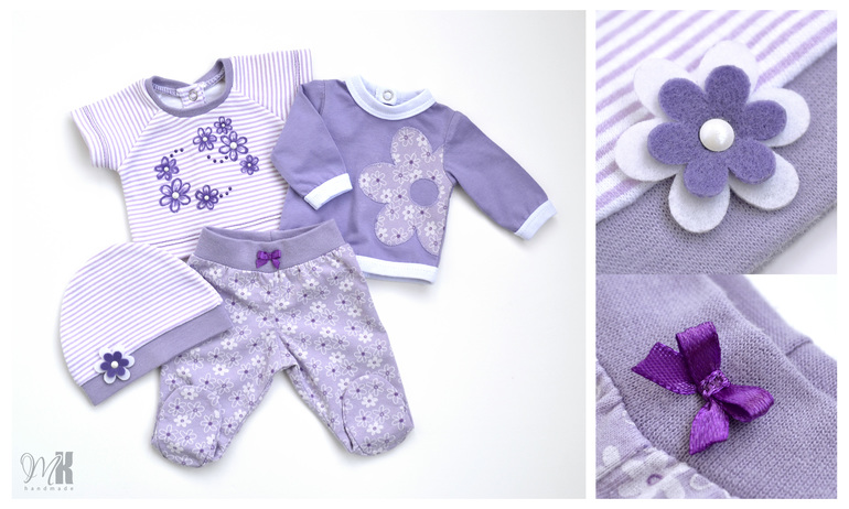 Комплект в сиреневых тонах, состоящий из ползунков, пары кофточек и шапочки.