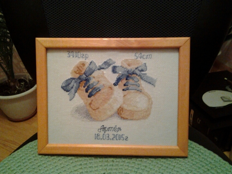 Чай очень нежный. Метрика с зайчишками такая забавная! А пинеточки - такие хорошенькие и очень нарядно выглядят на блестящей канве.