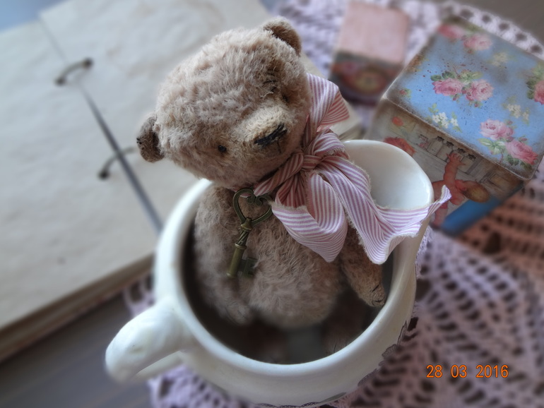 Тедди: мишки и их друзья.Мишка совсем кроха. Ростик 16см. Сшит полностью вручную из немецкой вискозы. Набит плотненько опилочками,утяжелен стальным гранулятом. Состарен,немного штопки. На шее бант с ключиком.