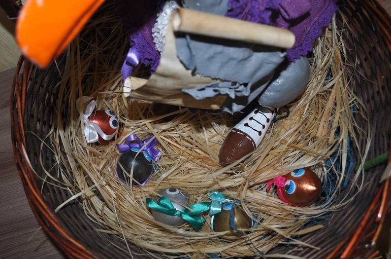 Композиция под названием "Закрыто на переучет". Гусь считает и записывает детей (яйца) - Петя, Миша, Настя, Саша и Вика))