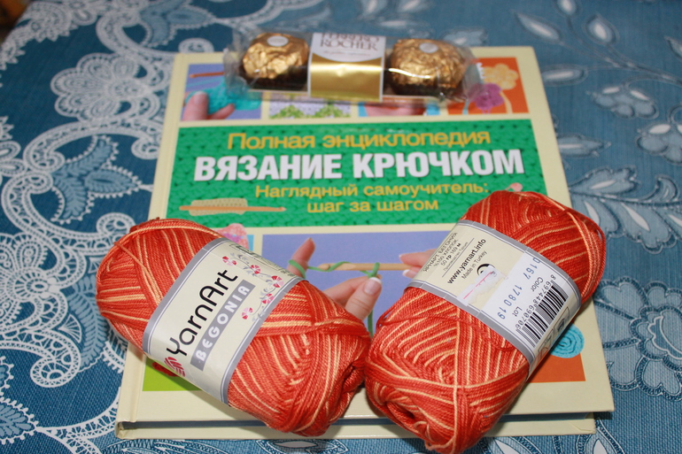 Замечательный слоник - оранжевая пряжа хлопок, энциклопедия по вязанию крючком - у меня никогда не было такой книги и мои любимые конфетки ))) Спасибо Наталье)))