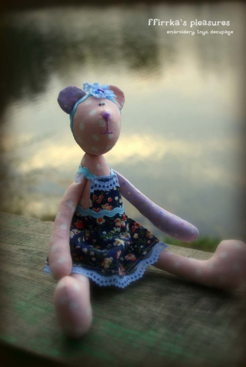 Описание: Очаровательная и озорная мишутка Кира. Р остом 28 см (16,5 см сидя), лапки на нитяном креплении, сшита из хлопка, наполнение синтепон.