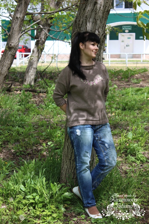 Машинная вязка (РАБОТЫ И СХЕМЫ)Очень мне нравится эта модель,теперь ещё из хлопка хочу такую.Эта связана из мериноса итальянского стокового,но совсем не жарко в нём.Ну и фото на лоне природы.