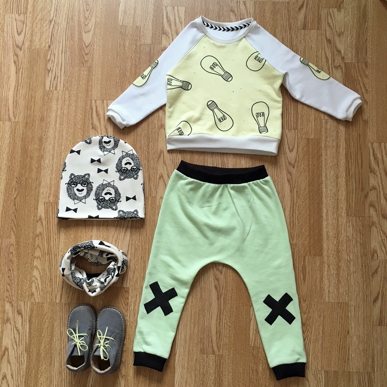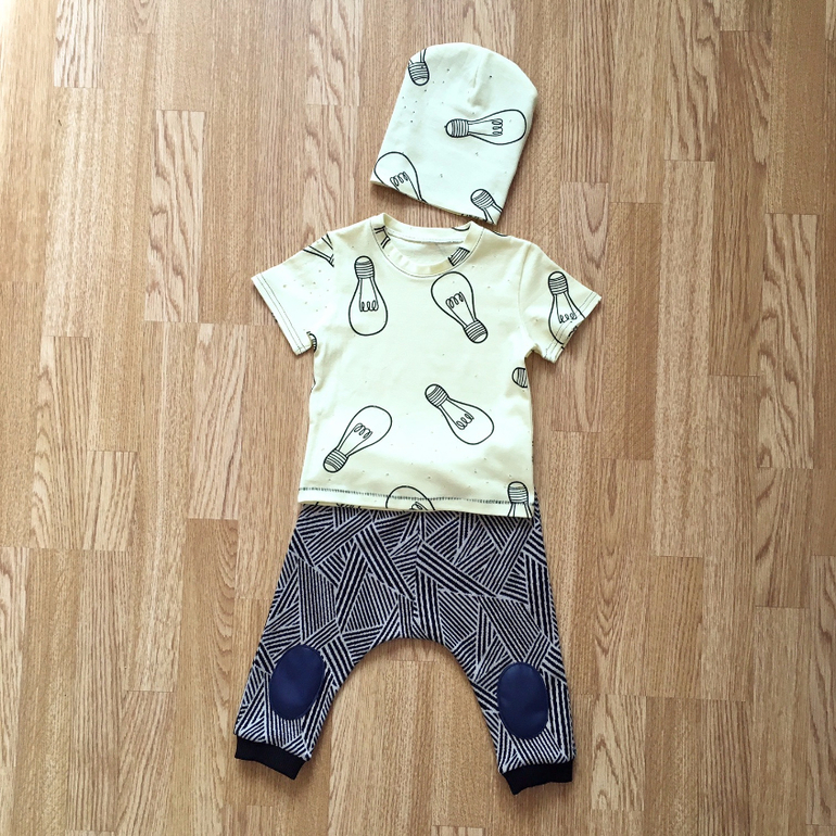 Шитье одежды, выкройки, ремонт одежды, шторы, швейные машины (уже приобретенные)Всем привет) Сегодня покажу сразу несколько комплектов. Как увидела эту ткань с лампочками - прям влюбилась) Цвет желто-салатный и серо-голубой. А еще она с дырочками - для летних футболок и легких шапочек очень клево смотрится) А для свитшота я ее продублировала белым тоненьким футериком) На свитшоте на локтях лампочки - аппликация.
