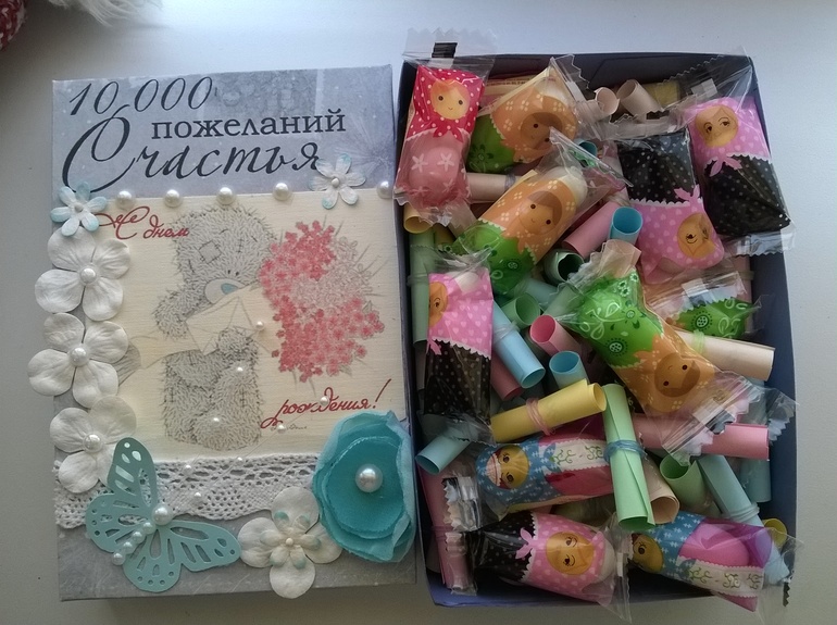 СкрапбукингВот такой подарочек - сюрприз получился для юной девушки которая увлекается фото и любит мягких мишек))) Буду очень рада если он ей понравится, узнаю я об этом через недельку, а пока фото... и да, в коробочку поместилось +-100 пожеланий.