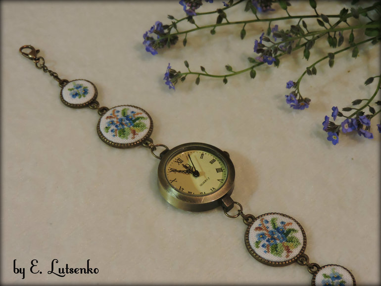 Бижутерия для слингомам. Слингобусы. Грызунки.Долго я вынашивала идею вышить наручные часы, и вот что у меня получилось! Правда я, как всегда, хотела вышить свои любимые розочки, но решила… пусть будут незабудки!