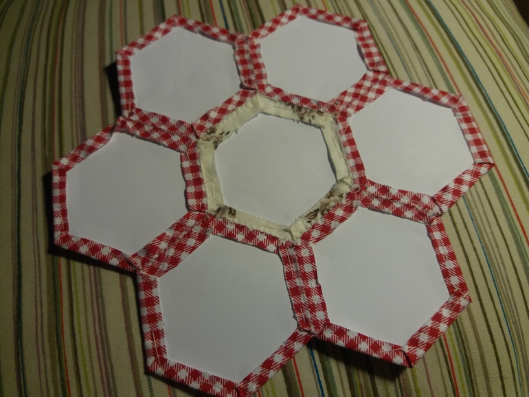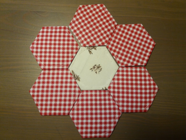 Выкройте две круглые заготовки из ткани и приметайте заготовку из шестигранников.