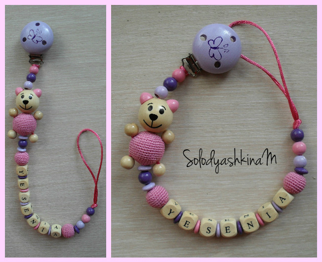 Подарки, игрушки, погремушки для новорожденных.Вот такая клипса для соски для девочки с очень красивым имеем Есения на днях смастерилась. Как мне кажется получилось нежненько :-) :-) :-) :-) Но этто так в промежутках между панамками, разнообразие для души. Очень люблю работать с такой фурнитурой.