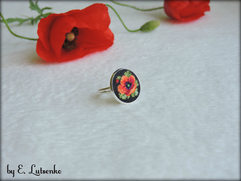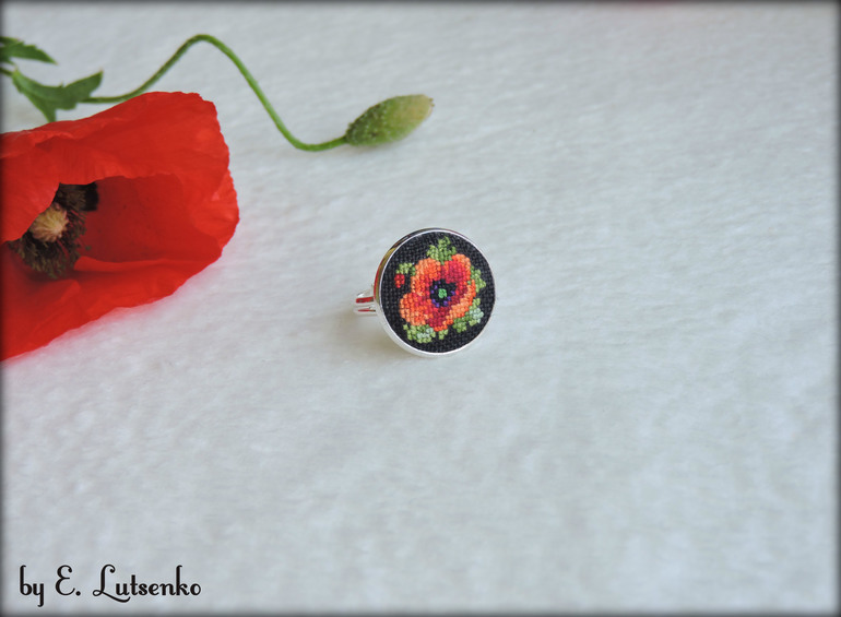 Кольцо с вышивкой "Маки на черном"