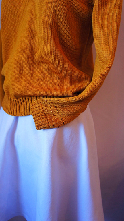 Кофта 90% шерсть мериноса 10% кашемир. на погонах и рукавах в ручную вложены бусины . На спинке вырез тоже V Юбка джинсы.