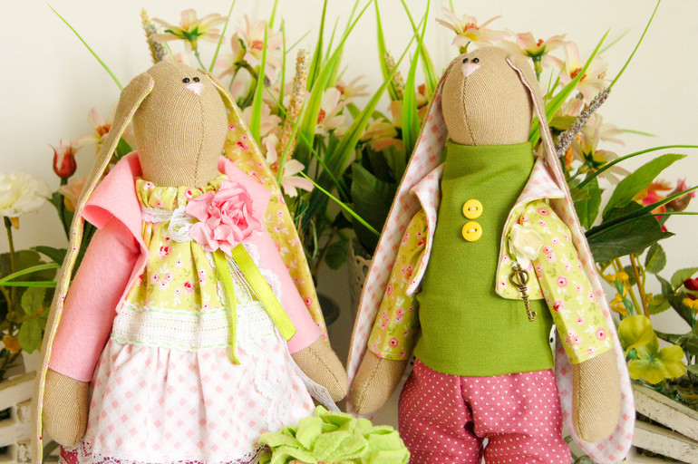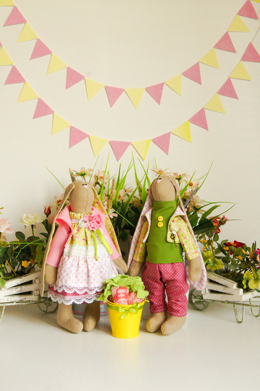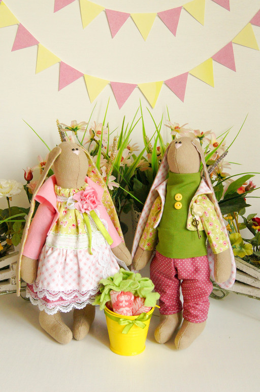 Игрушечный мир - животныеЗайки в стиле тильда, шила для выставки. Позитивчики получились) Рост 32см.
