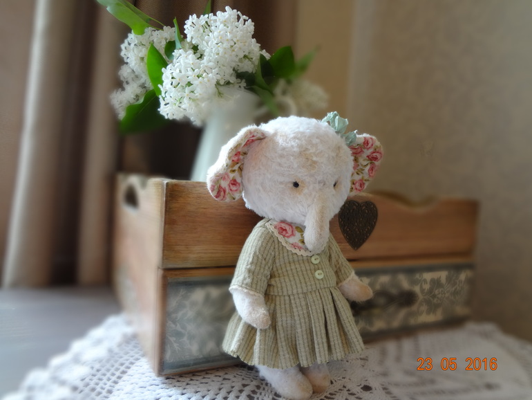 Тедди: мишки и их друзья.Слоня тедди сшита из вискозы ручного окраса,набита плотенько опилочками,в животике металлический гранулят. 6 шплинтов,голова покачивается. Стеклянные глазки. Платье из японского хлопка. Сшита слоня полностью вручную с большой любовью и теплом.