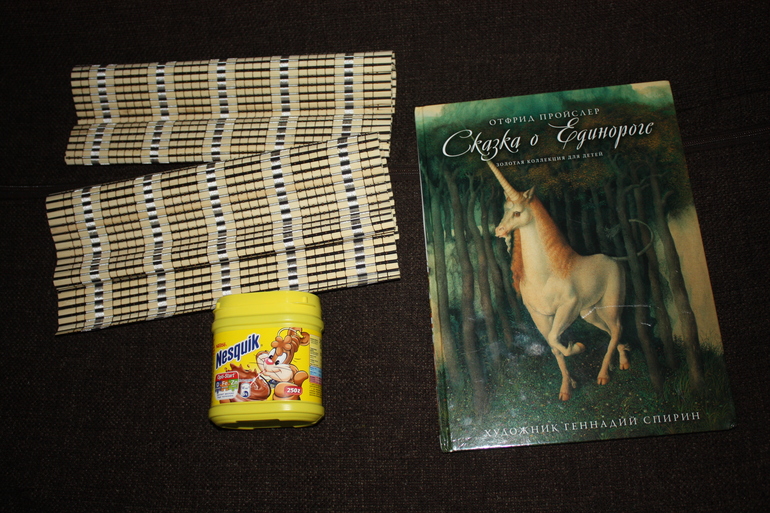 Получили мы подарочки в виде ковриков, несквика и очень милой книги про единорога. Мы ее сразу стали читать в парке, куда отправились после почты. Очень классная книга и иллюстрации очень сказочные