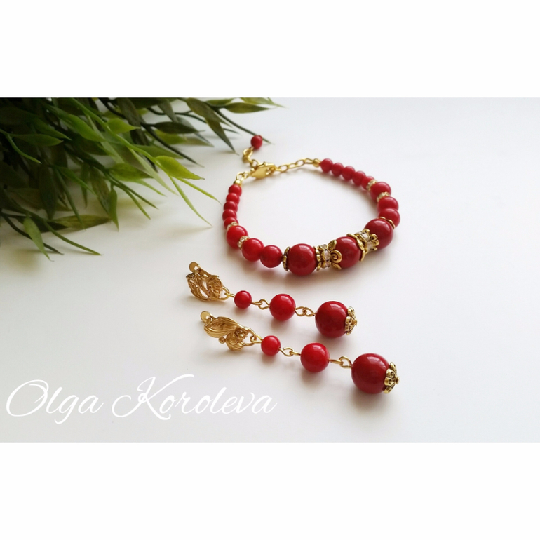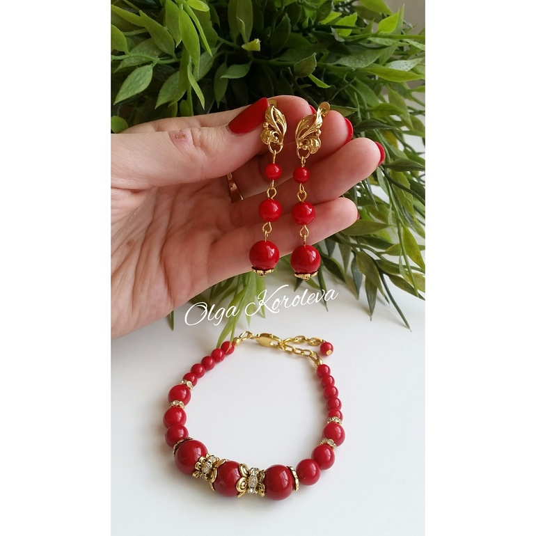 Бижутерия для слингомам. Слингобусы. Грызунки.Для творческой личности даже красный лак - повод для вдохновения! Собрался вот такой яркий, нарядный комплект из натурального красного коралла и красной майорики. Браслет универсального размера, он регулируется цепочкой-удлинителем. Основы серег с позолотой.