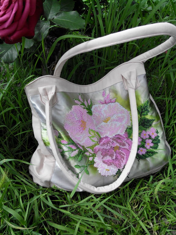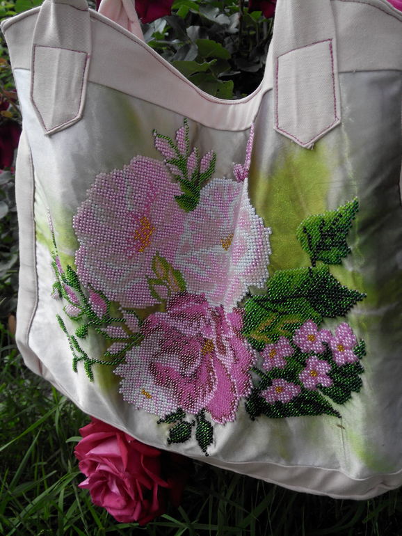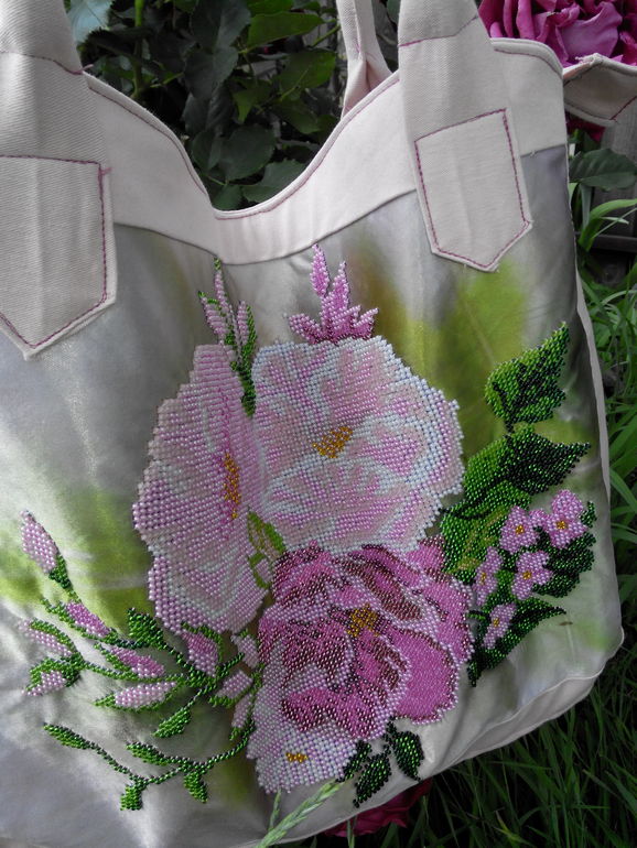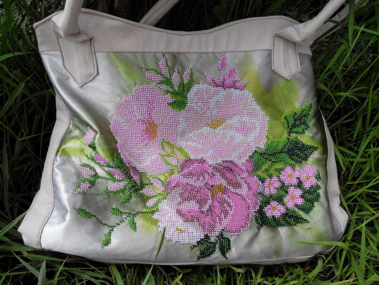 Бисер. Бисероплетение. Украшения из бисера.У меня голова кипела, могу сказать что получилось, ну конечно не без ошибок ибо я не профи. Нежно- розовый джинс в цвет с бисером( фото из телефона), ручки синтепон, вышивка чешский бисер, атласная основа.