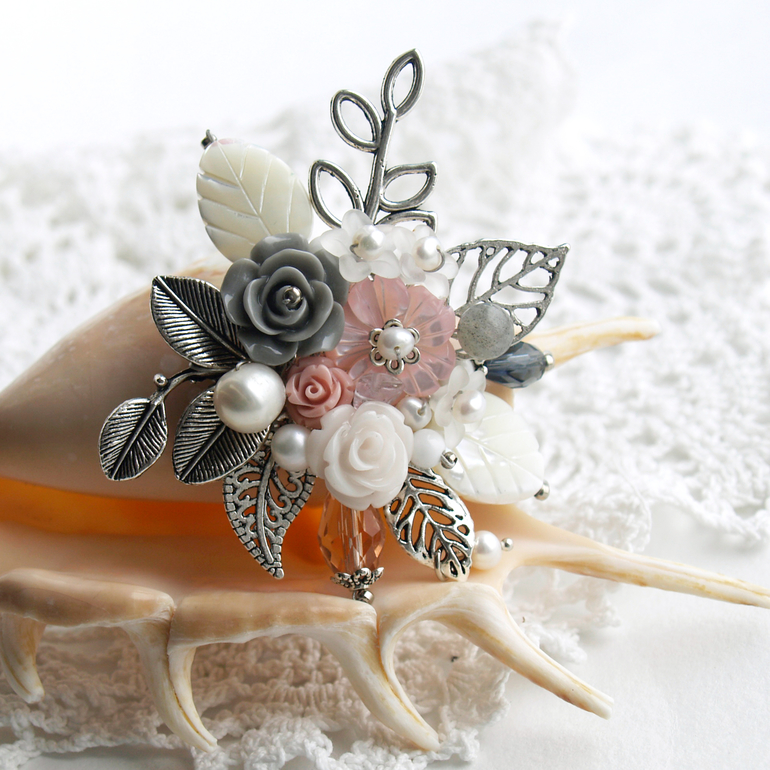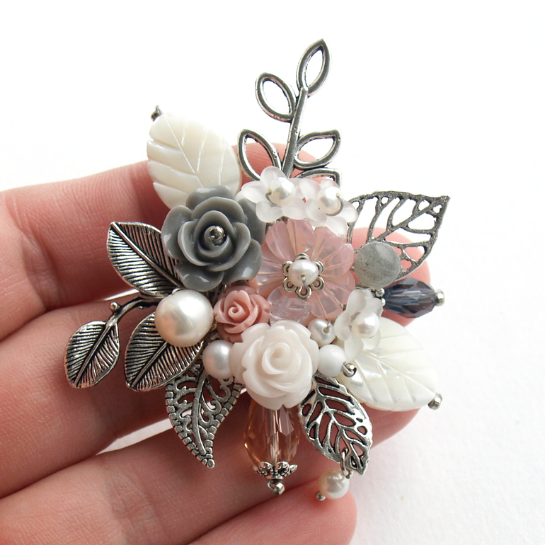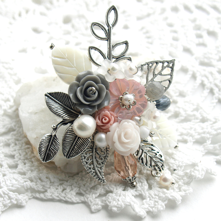 Бижутерия для слингомам. Слингобусы. Грызунки.Вот такая брошечка в серо-розово-жемчужной гамме собралась )