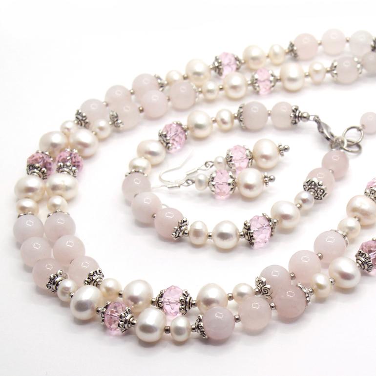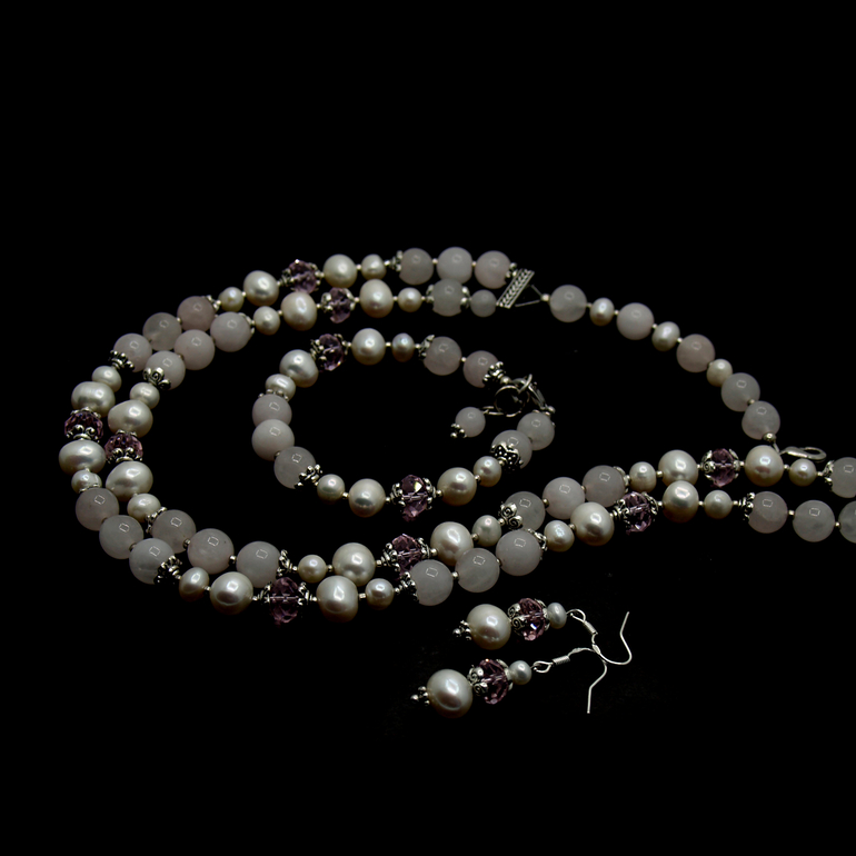 Комплект состоит из колье, сережек и браслета. Собран из натурального жемчуга, розового кварца, ювелирного стекла.