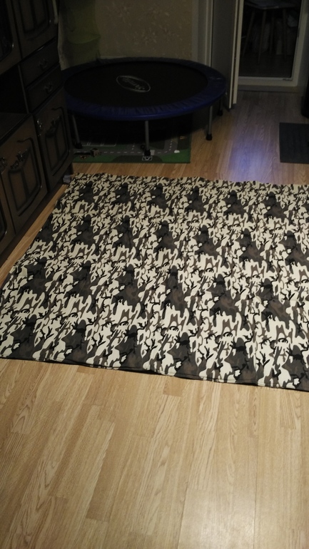 Снизу плащевка оксфорд. Внутри 2 слоя подложки под ламинат. А валяться мы будем на мягонькой не маркой кулирке. Довольна как слон.