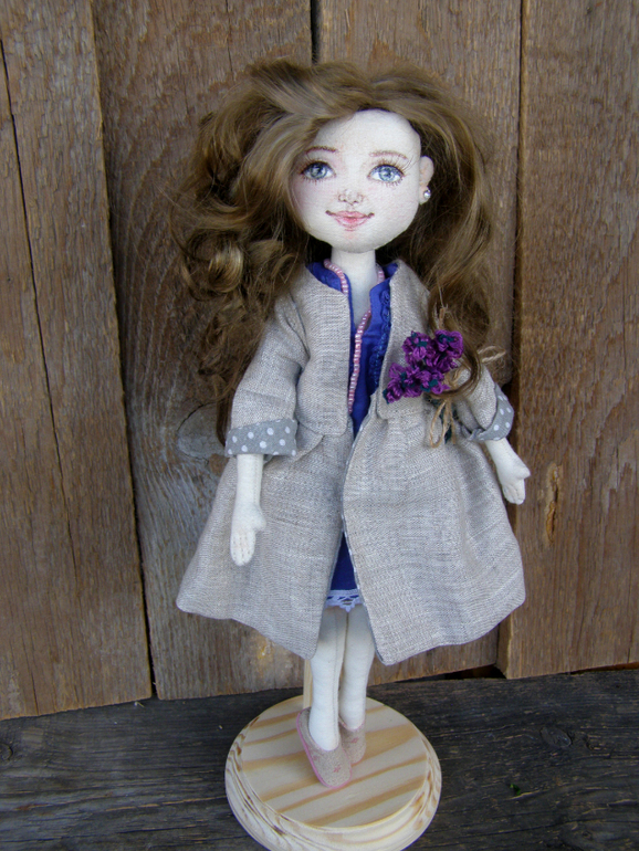 Кукольный мир - человекоподобные куклыВ этот раз куколка по фото...прекрасная девушка . Сшита из небеленого хлопка. Стоит с подставкой. Сидит красиво). На ножках обувка ручной работы. Волосы проклеены и прошиты, можно причесывать и делать прически. Три комплекта нарядов. Вся одежка съемная. Реснички приклеены, личико расписано акрилом и маслом.У малышки подвижные ручки и ножки. Из аксессуаров букетик лаванды и Евангелия. Жаль что нет фото для сравнения(.