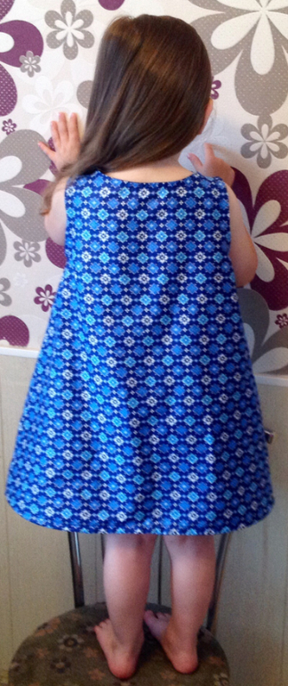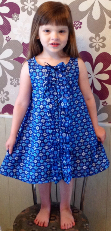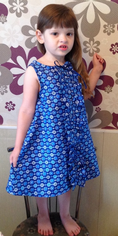 ВНИМАНИЕ. Ширина подола по выкройке должна быть 30см, а не 60см, как указано, потому что выкройка 1/2 переда и 1/2 спинки. Таке обратите внимание на ширину горловины, застежки нет, платье надевается через голову, чтобы голова вашего ребенка проходила. Я сделала вырез горловины переда на 1см глубже выреза спинки.