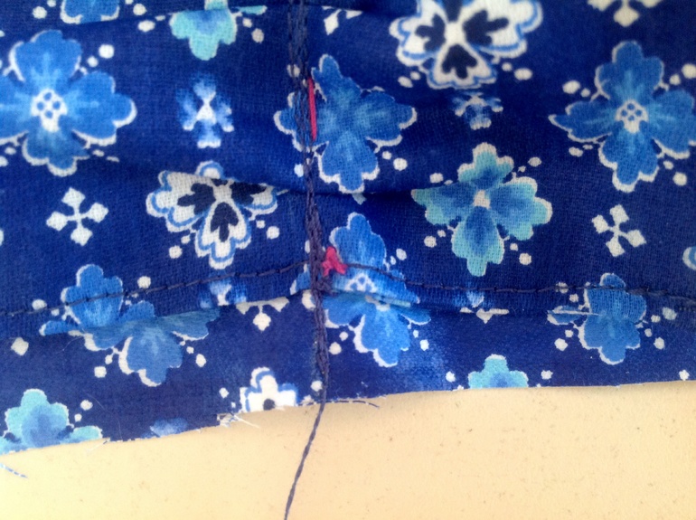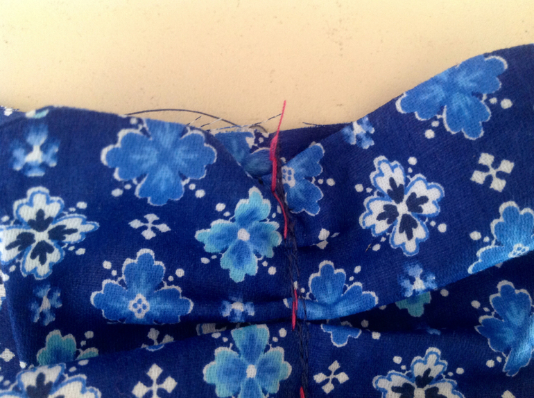2. Пристрочить сосборенную полоску по середине переда, при этом необходимо отступить от верха (горловины) и низа (подола) по 1см.
