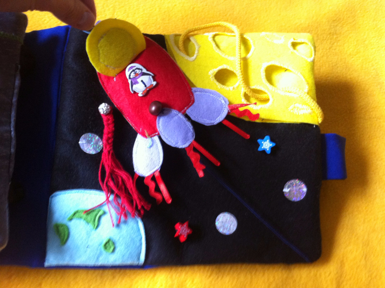 Обложку книги решила не нагромождать, аппликация самолета и бубенчик. Жесткий переплет у книги, закрывается на магнитную кнопку. Все страницы съемные, очень удобно - не обязательно стирать всю книгу, когда испачкается и так же удобно брать с собой)