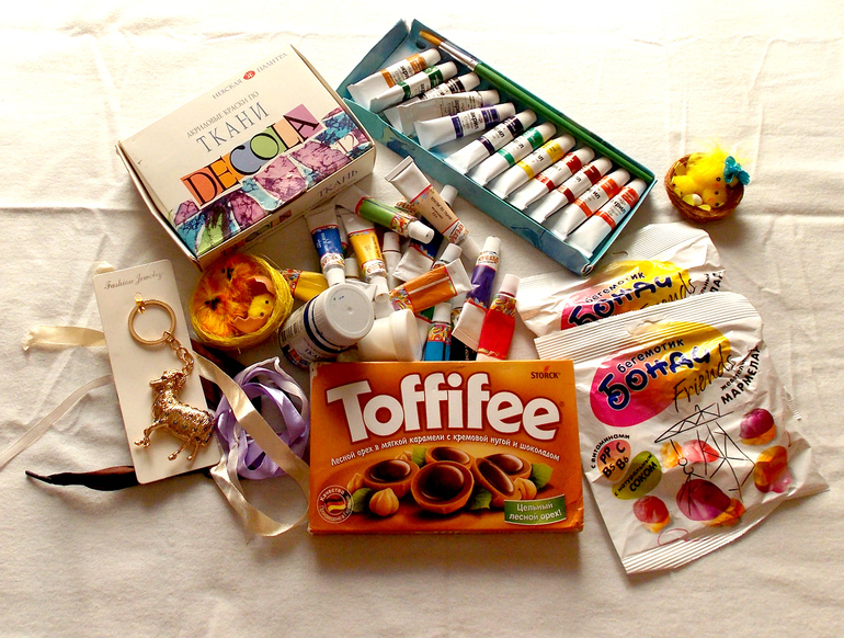 Обмены подарками, материалами для рукоделия (хвастики)Сегодня получила посылочку от замечательной БэБэшечки Елены https://www.babyblog.ru/user/lenta/id1463535. Спасибо огромное!!! Столько красочек!!! Давно мечтала попробовать порисовать на ткани...Сынуля маленький сразу прихватизировал коробочку с вкусными конфетками (коробочки - это наше все)), а потом "положил глаз" на замечательного барашка-подвеску.
