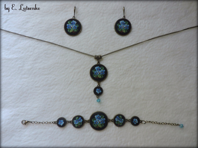 Продолжаю коллекцию со старинной вышивкой 19 века! На этот раз комплект с голубыми фиалками: браслет, кулон и серьги! Много фото...