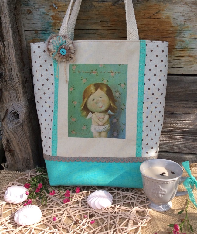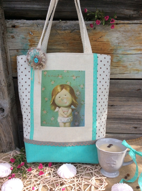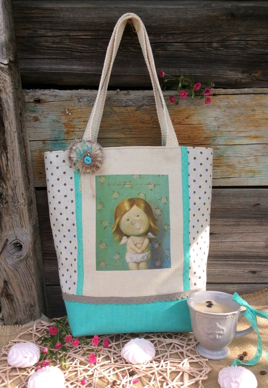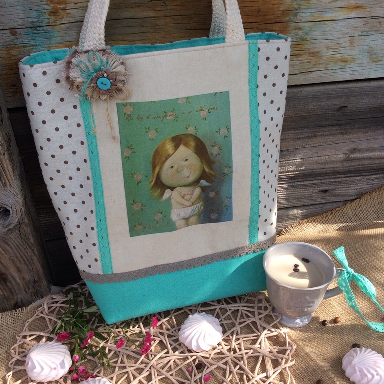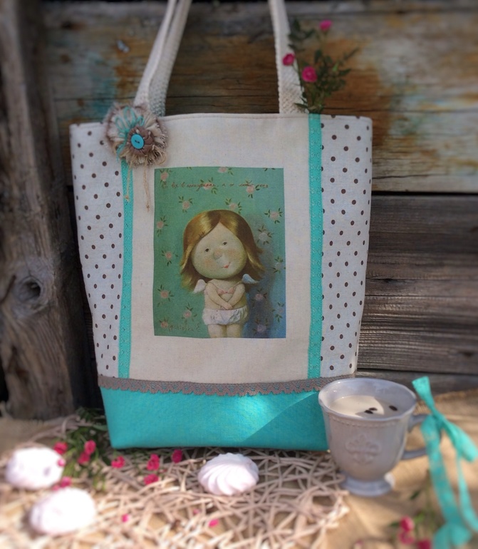 Шитье одежды, выкройки, ремонт одежды, шторы, швейные машины (уже приобретенные)Сумочка tote текстильная "Mint and Chocolate", с принтованным на льне рисунком, по мотивам картины Е.Гапчинской "Я вся в веснушках, а он меня любит". Прекрасный летний шоппер, который сделает look стильным. Очень хорошо сочетается и с рваными джинсами и с платьем, сарафаном в пол. Использованы только натуральные материалы премиум класса (лён, хлопок, бязь).