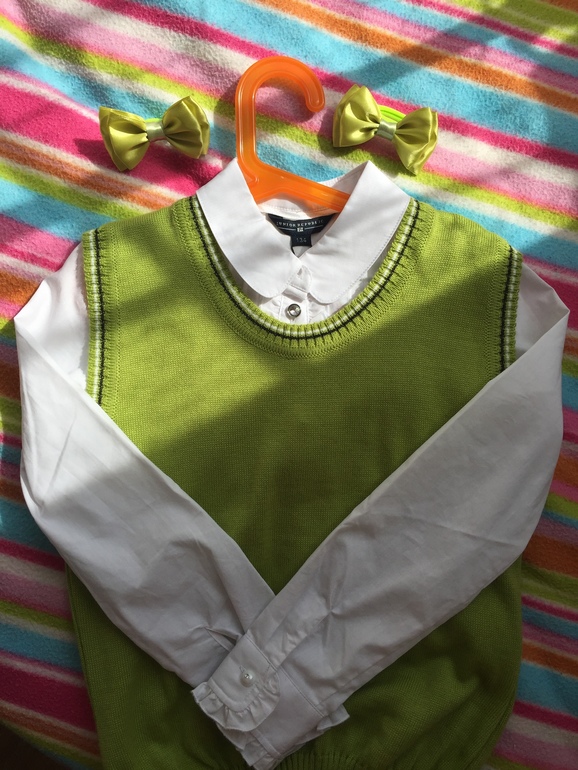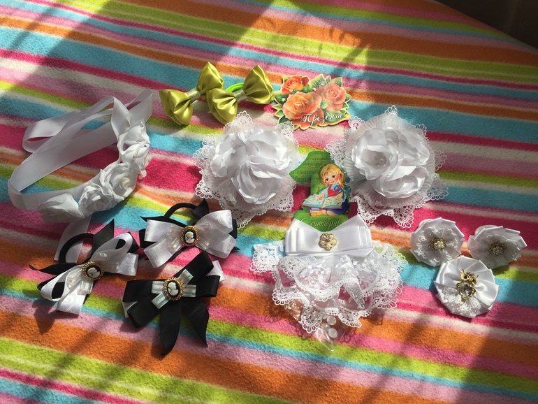 В синей коробочке были заколочки, которые сделала для моей первоклашки мастерица Татьяна https://m.babyblog.ru/user/info/Tata1520! Танечка, у вас золотые руки!👍🏻💐 Это такая красота!!! Все комплекты были аккуратно упакованы в пакетики! В коробочке дополнительно мы нашли открыточку к 1 сентября😄👏🏻! А еще там лежал дополнительный набор зеленых бантиков специально под нашу обязательную жилетку!🎀😘 сказать, что мы в восторге-это ничего не сказать! Все комплекты идеально подходят под дочкину форму!