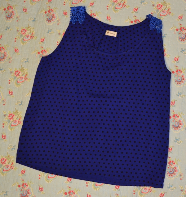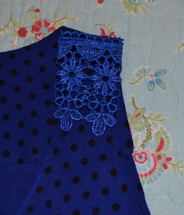 По фото кажется, что горошки на синем-черные. Я бы заменила синии вставки на черное кружево. Или пришила две бархатные ленты и завязала банты на плечах)))