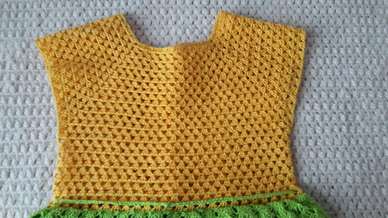 Дошли руки выложить еще одно платьице. Вязала из ириса. Крючок 1.5. Желтых ушло 5 мотков, зеленых 4 и еще чуть-чуть.