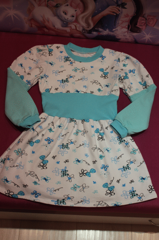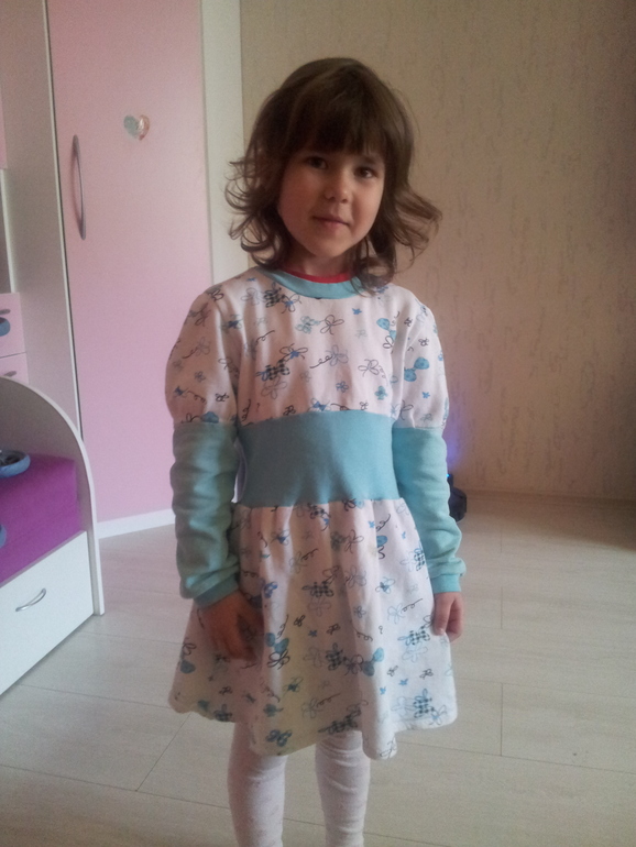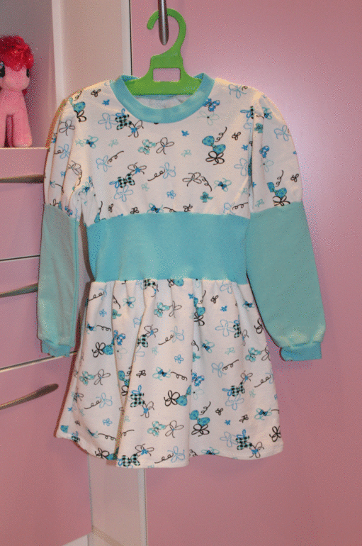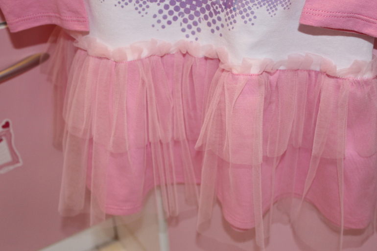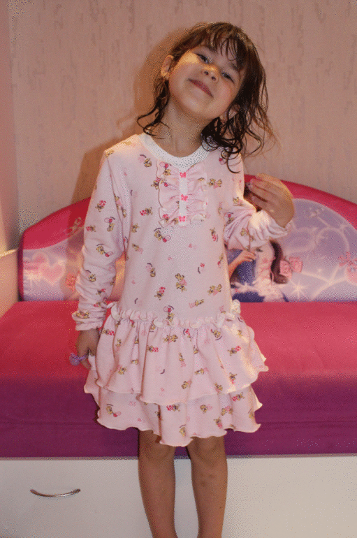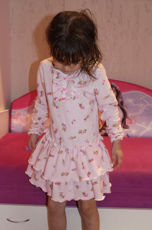 3. Легенькое платье из кулирки х/б, на юбочке дополнительно пришито 2 слоя мягкого фатина разной длинны. Полочка украшена термотрансфером, горловина обработана бейкой из основной ткани цепным стежком на распошивальной машинке, рукава и низ платья подшиты на распош. машинке.