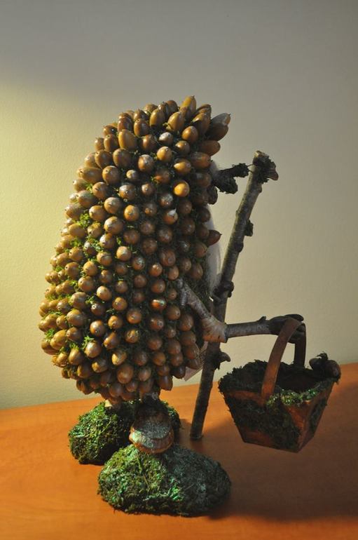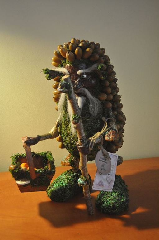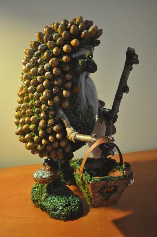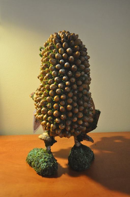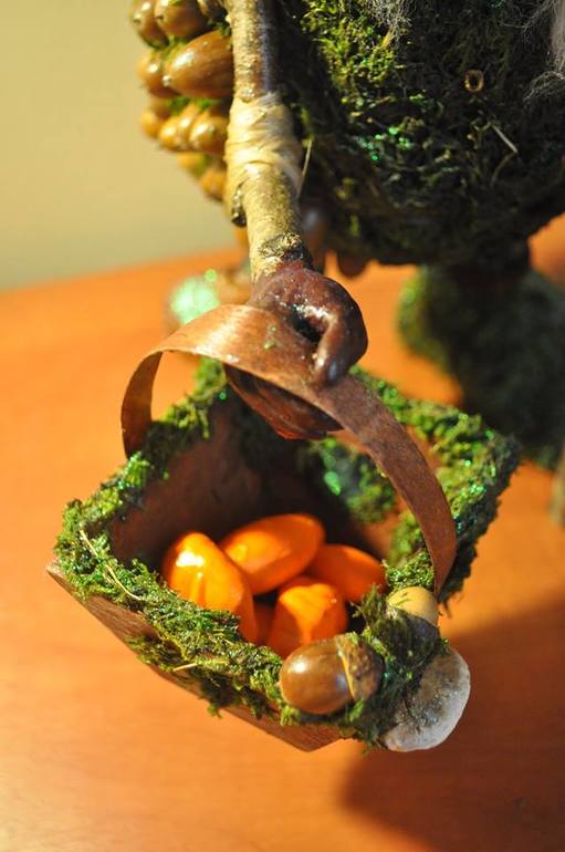 Каркас, на нем лицо из пластики, ноги и руки вкручены в каркас, когда лицо высыхает, приклеиваем его, а потом декодируем все желудями, мхом. Каркас ног из проволоки, задекорирован мхом. Красим лицо, приклеиваем и декодируем руки. Ладони тоже из пластики)))