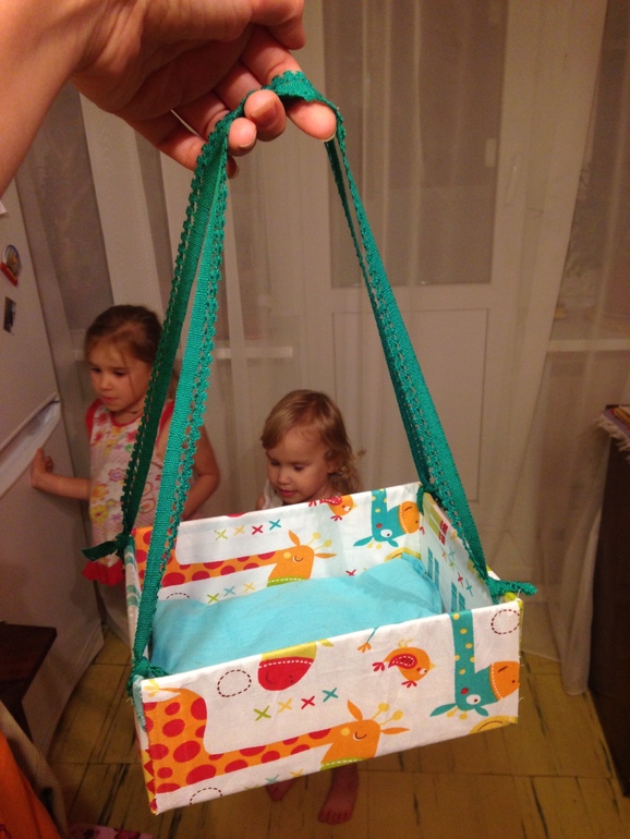 Просто полосы ткани приклеила пистолетом на коробку из-под детской обуви и пошила матрасик. Через дырки крючком продела тесемки