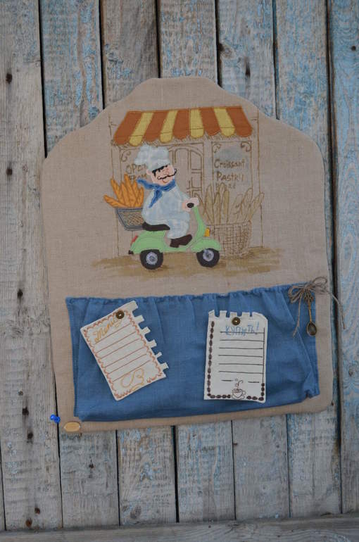 Фон рисовала красками по ткани, повар из лоскутков и чуть вышивки. Карман на резинке, а листочки блокнота тоже вышила. Повара тоже немного тонировала красками. Мне очень нравится, а Вам?)))))