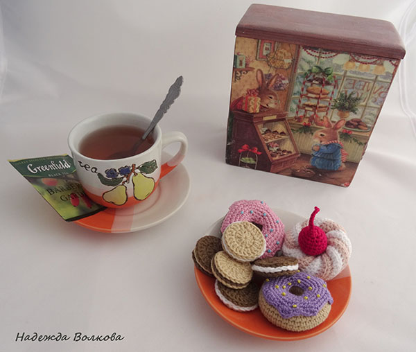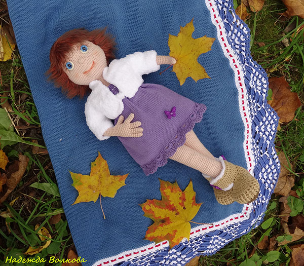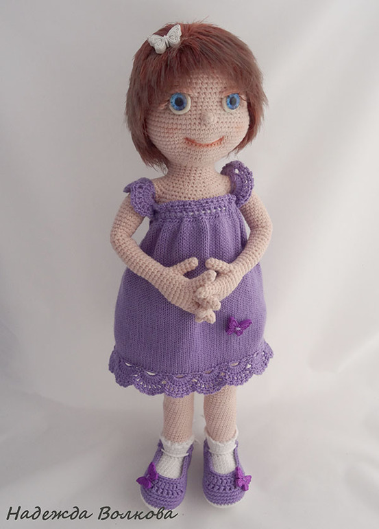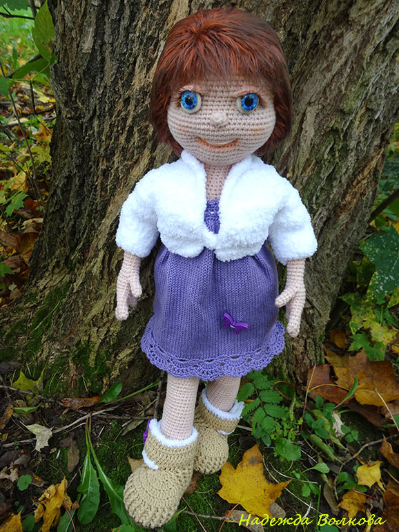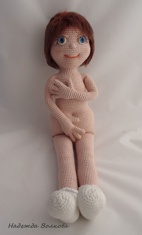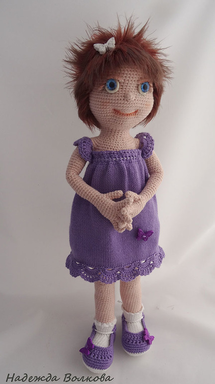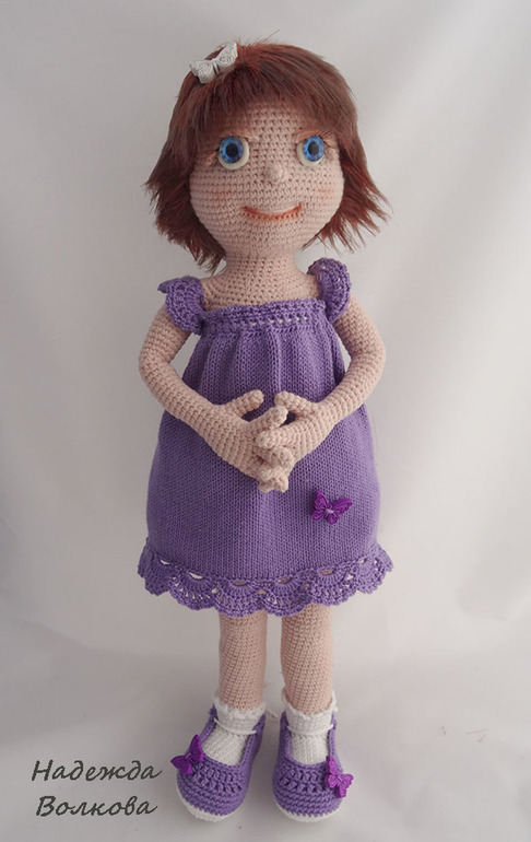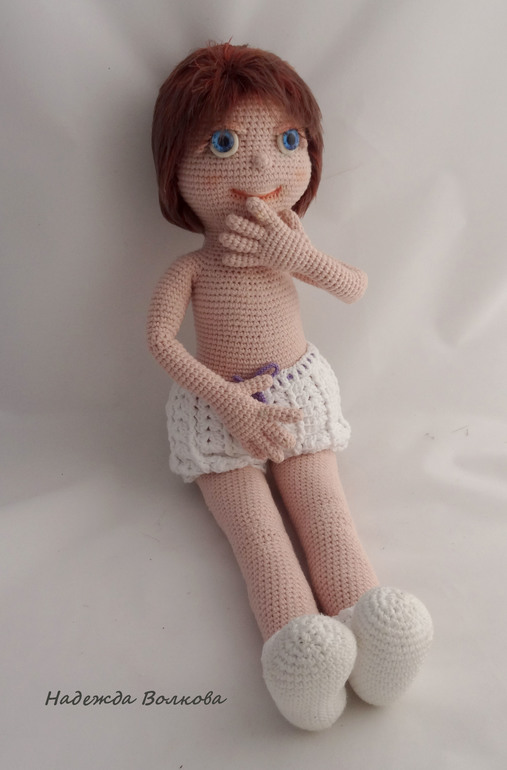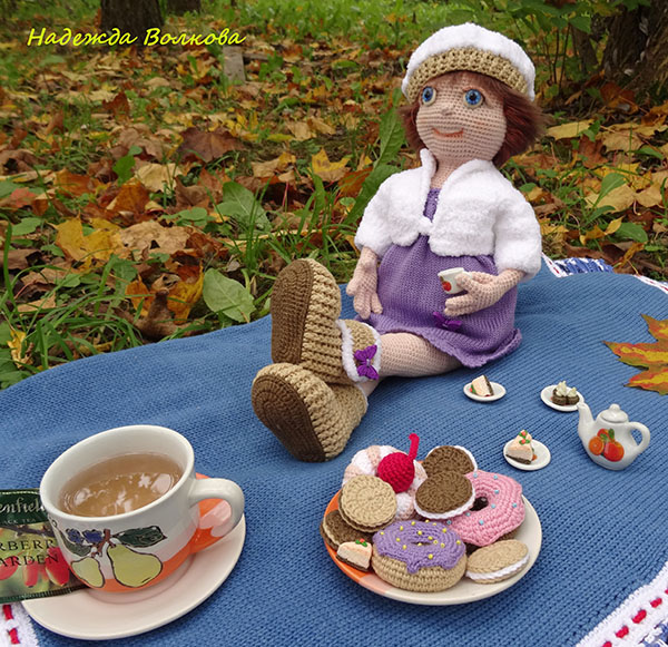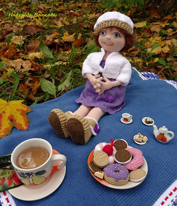 Амигуруми (вязаные игрушки)Для обменчика с связалась игровая бескаркасная куколка, ростиком 45 см, сидит с опорой, сама не стоит, одежда съемная, волосы можно расчесывать. Пряжа Джинс. крючок 2. Куколка страшная сладкоежка, даже отдых на природе не обходится без сладких пончиков) пончики были тоже связаны в комплект к кукле.