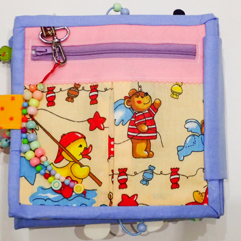10 страниц, 45 съемных элементов, огромное количество пуговичек и бусинок порадовали малышку. А большое количество застежек отлично развивают мелкую моторику.