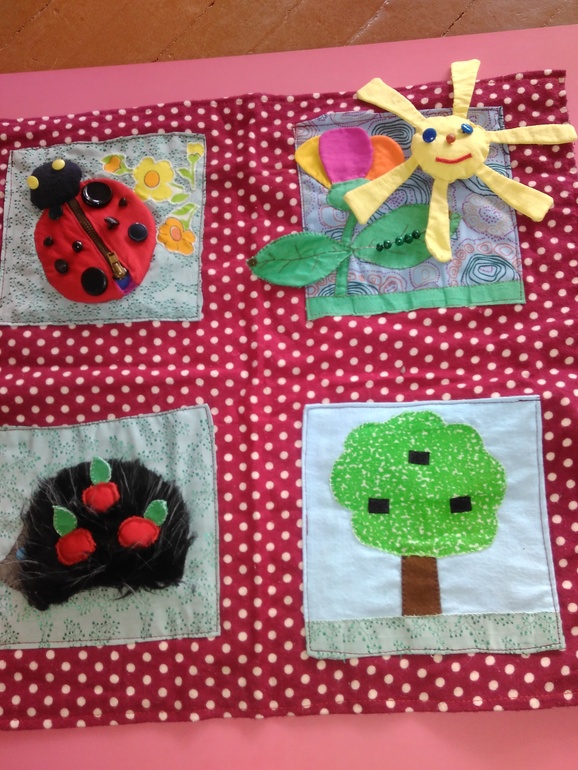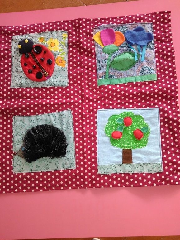 У божьей коровки замочек растягивается, крылышки шелестят, пятна (пуговицы) рассчитаны на тактильные ощущения и на обучение большой-маленький. Листик у цветка на кнопке, под листиком гусеница из бусинок на проволоке (можно перебирать и перекатывать), солнышко на липучке, можно заменить на тучку. У дерева и ёжика яблоки на липучке и можно переставлять туда и обратно