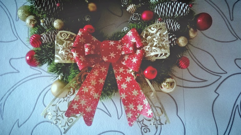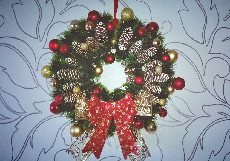 Вот такой новогодний венок делала в прошлом году. В красно - золотом цвете.)))Делала в первый раз и вот что получилось.))))))